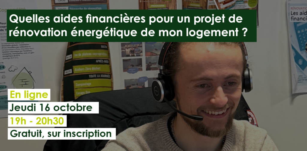 Nous vous donnons rendez-vous jeudi 16 octobre de 19h à 20h30, lors d’un webinaire, animé par un conseiller France Rénov’, pour faire le point sur les aides financières !